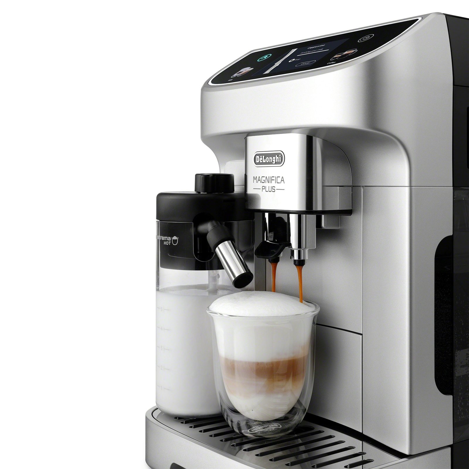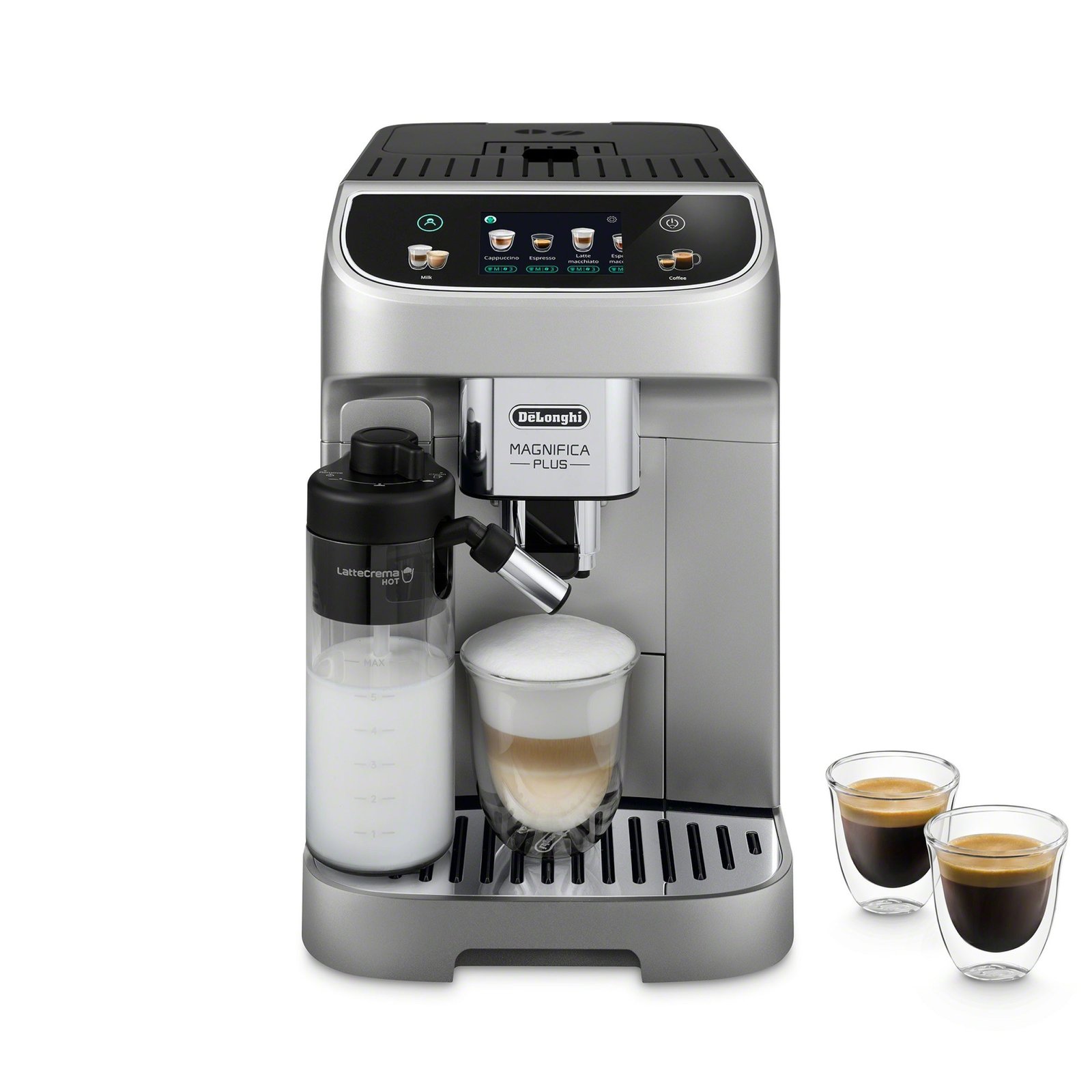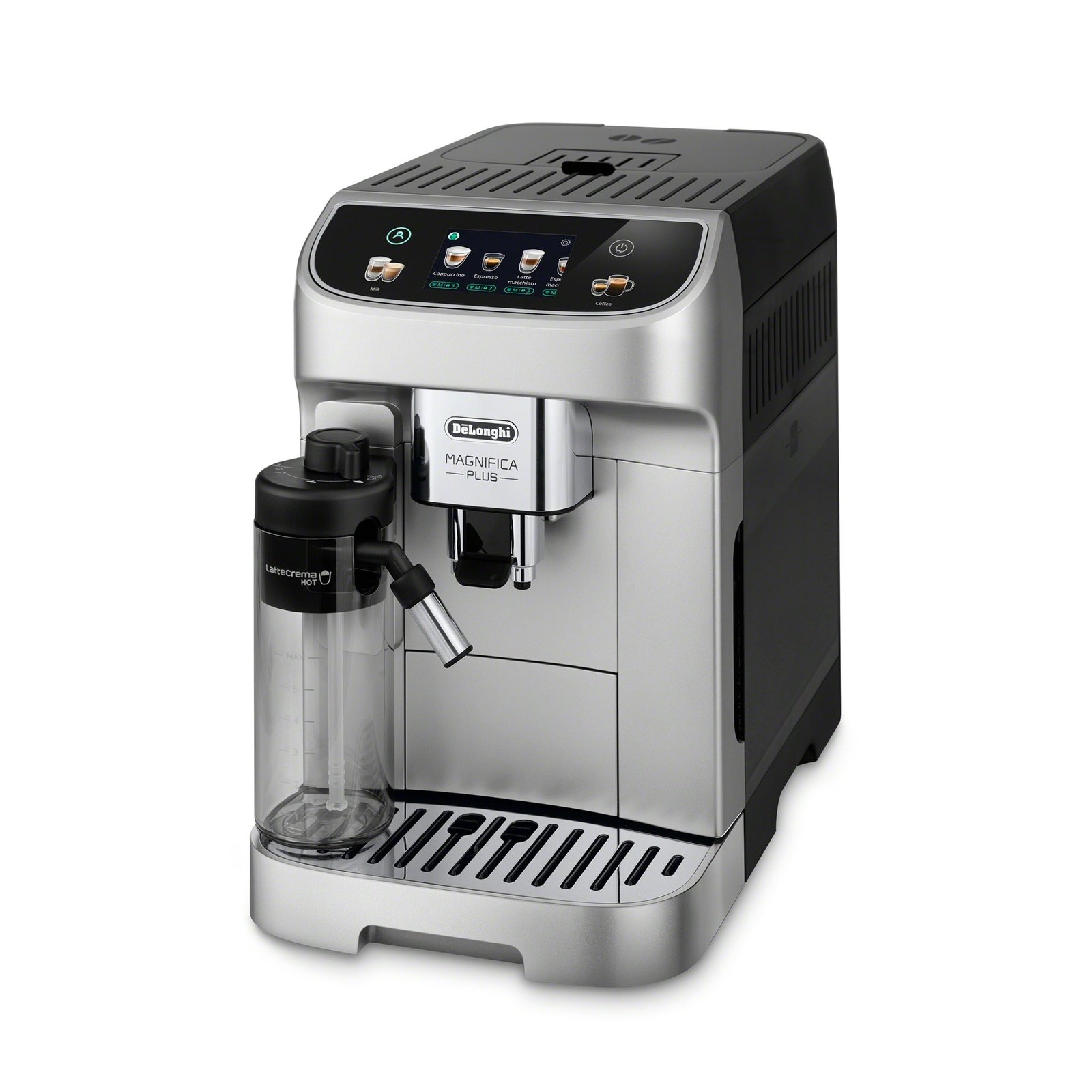 The DeLonghi Magnifica Plus ensures you have everything you need to make magnificent espresso, lattes, and more right in your own home. Equipped with a touchscreen display, DeLonghi’s adjustable LatteCrema milk carafe, and enough programming to recreate most popular coffee recipes; the Magnifica Plus puts a cafe’s worth of coffee just one touch away. 18 preset drink recipes, programmable drink strength, length, and temperature, and special options for iced coffee and more make the Magnifica both convenient and capable.
