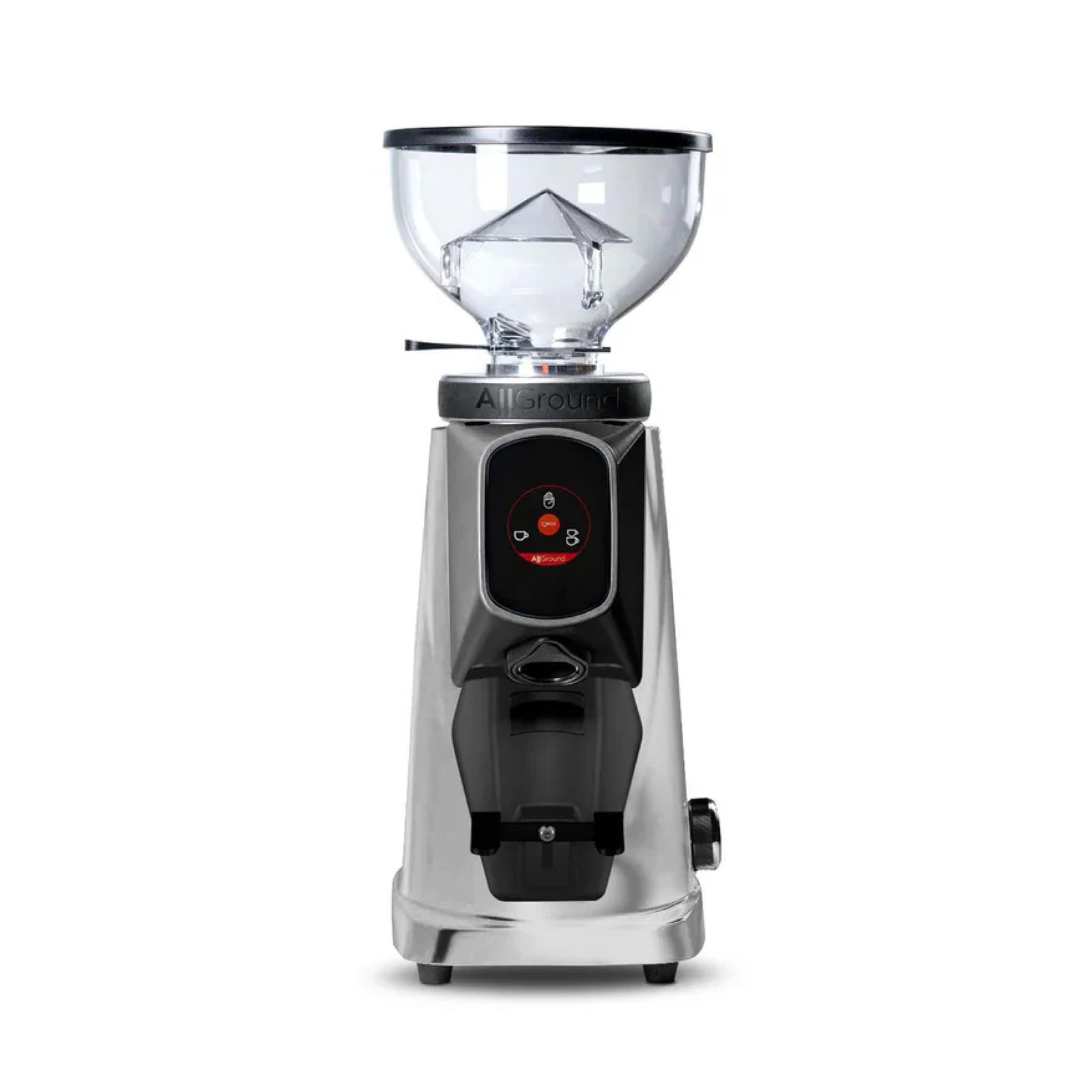 Looking for a grinder that can do it all? Look no further than the Fiorenzato AllGround Sense Espresso and Coffee Grinder. Designed to bring grind-by-weight accuracy to any brew method, the Sense features a built-in load cell and weight programmable dosing for each of its brew methods. The Sense can…sense what grind range you’ve set the grinder in, and adjusts its touchscreen interface and programming to match—Red for espresso grinds, Blue for moka pots and other fine grind methods, and Green for filter brewing. The espresso grind range gets 2 programmable doses and a manual grind option, while moka and filter ranges get 3 doses each. Grind settings are easily repeatable thanks to the Sense’s micro-step grind adjust and clear markings. This grind adjustment system pairs well with Fiorenzato’s 64mm ‘Dark-T’ coated burrs, which do an admirable job at grinding across ranges and promise extended service life thanks to their titanium-based coating. Other barista-focused features include a sound-insulated case for quieter grinding, tool-free access to the burrs for cleaning, and a just-right half-pound hopper capacity for everyday use.