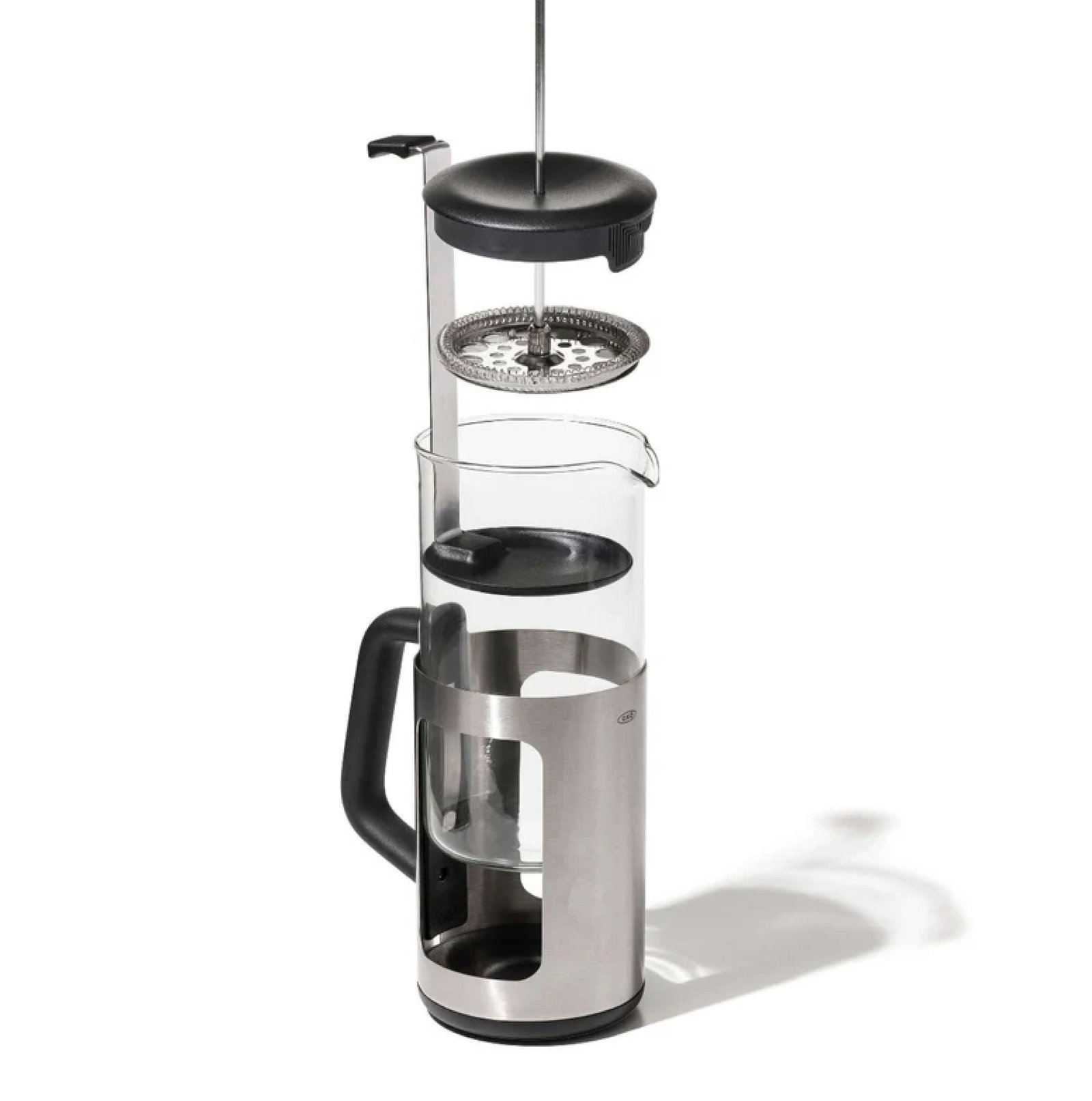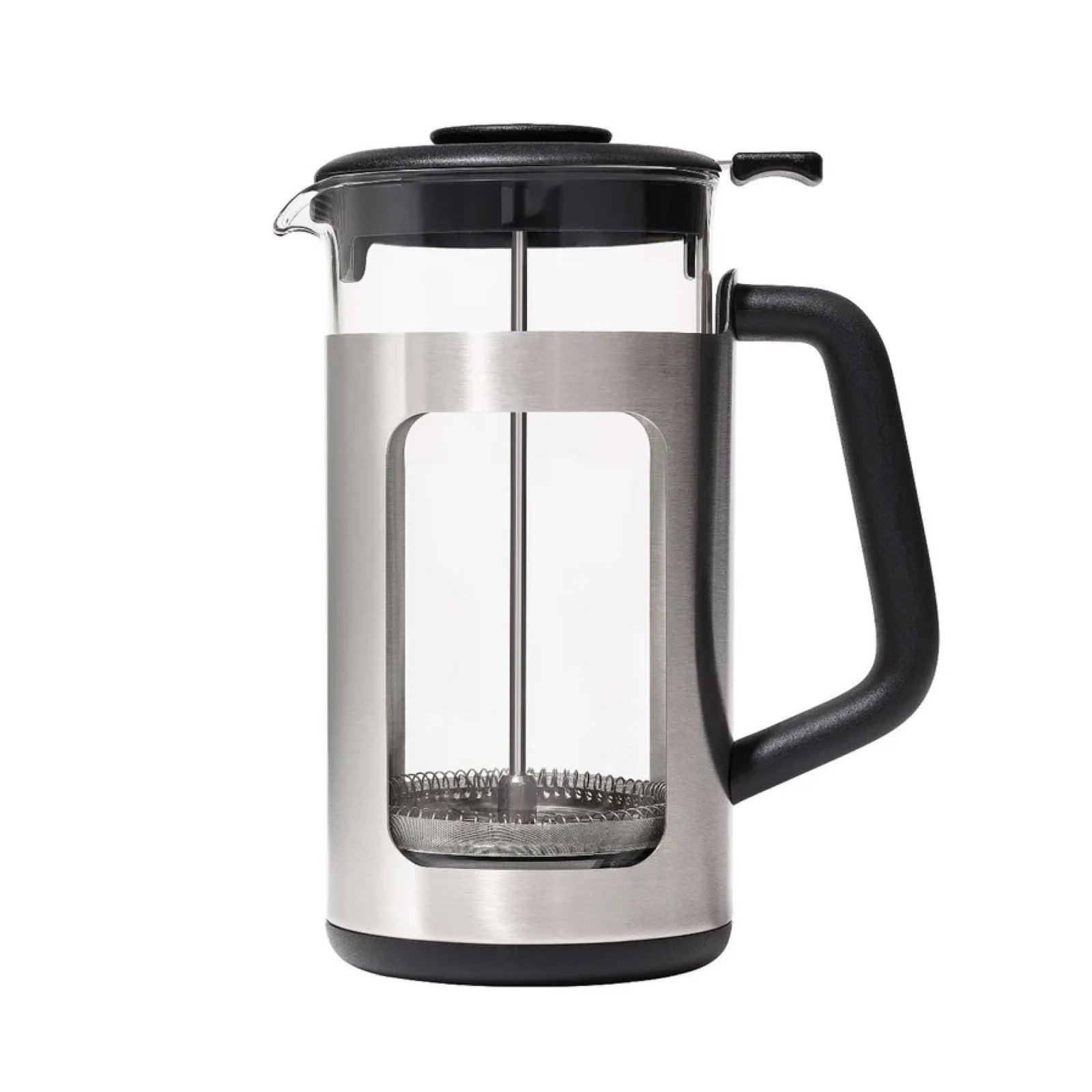 Love french press coffee but hate the cleanup? The Oxo 8 Cup French Press features a unique grounds lifter to help you remove grounds from the press after drinking. The base of the Oxo press is all classic, a 32 ounce borosilicate glass vessel holds your grounds and hot water, while a stainless steel outer protects it from bumps and knocks. The grounds lifter sits in the base during brewing, and will pull up your grounds for disposal, preventing the sludgy press cleaning you’ve come to expect from press style coffee. Dishwasher safe.