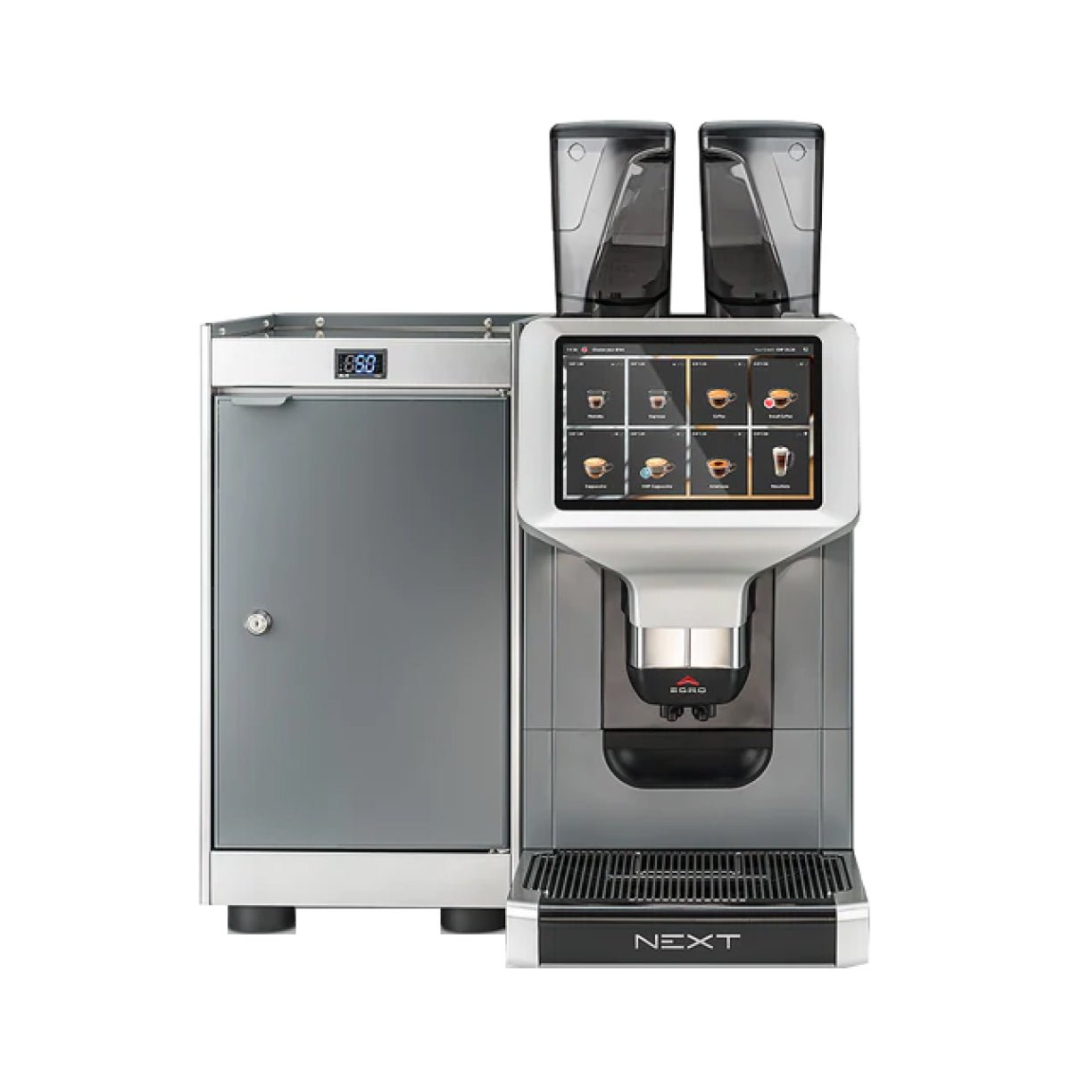 - Pure Coffee – Designed with full capacity to make every drink on the menu, the Egro NEXT Pure Coffee model comes with dual grinders and an optional steam wand or upgraded iSteam wand for automatic milk frothing. Controls are managed through a front-mounted tablet and a companion app for convenience.